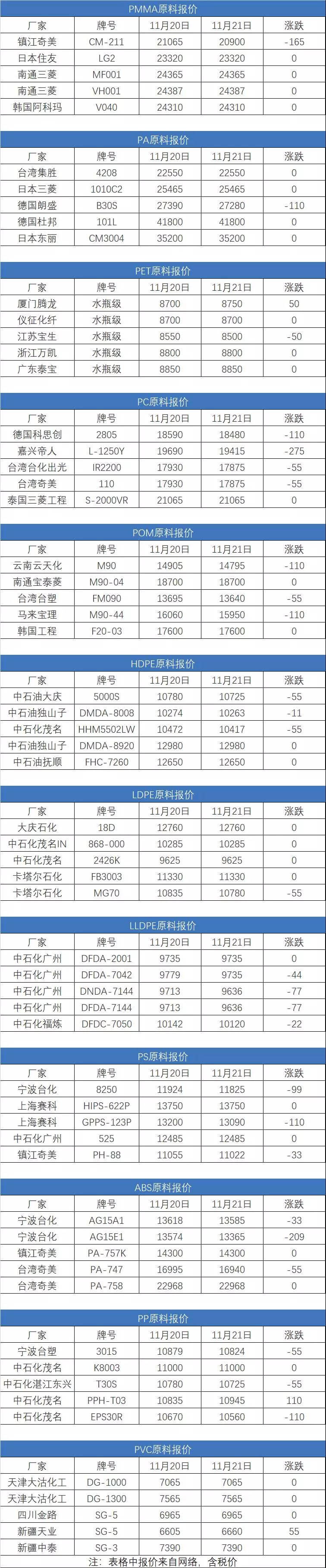 11月19日塑膠原料報價PE塑膠原料? 市場價格震蕩下跌,線性期貨雖高開走高,但石化企業延續降價銷售,市場氣氛偏空。華南地區LLDPE價格在9350-9800元/噸。 PP塑膠原料? 市場延續弱勢盤整,部分石化廠價下