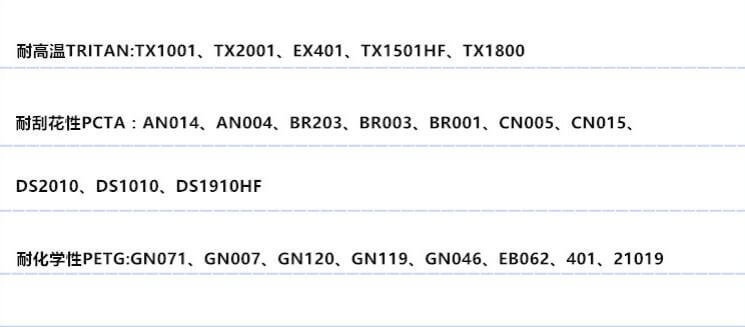 伊斯曼化學EASTAR係列PETG共聚多酯原料 你要找的型號就在下麵:(請用Ctrl+F鍵查找牌號更快捷)