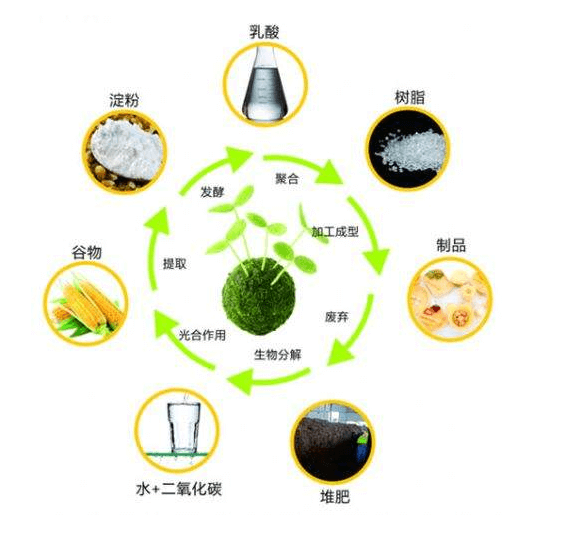 聚乳酸(PLA)是一種新型的生物降解材料,使用可再生的植物資源(如玉米)所提出的澱粉原料製成。澱粉原料經由糖化得到葡萄糖,再由葡萄糖及一定的菌種發酵製成高純度的乳酸,再通過化學合成方法合成一定分子量的聚乳酸。其具有良好的生物可降解性,使用後能被自然界中微生物完全降解,最終生成二氧化碳和水,不汙染環境,這對保護環境非常有利,是公認的環境友好材料。
