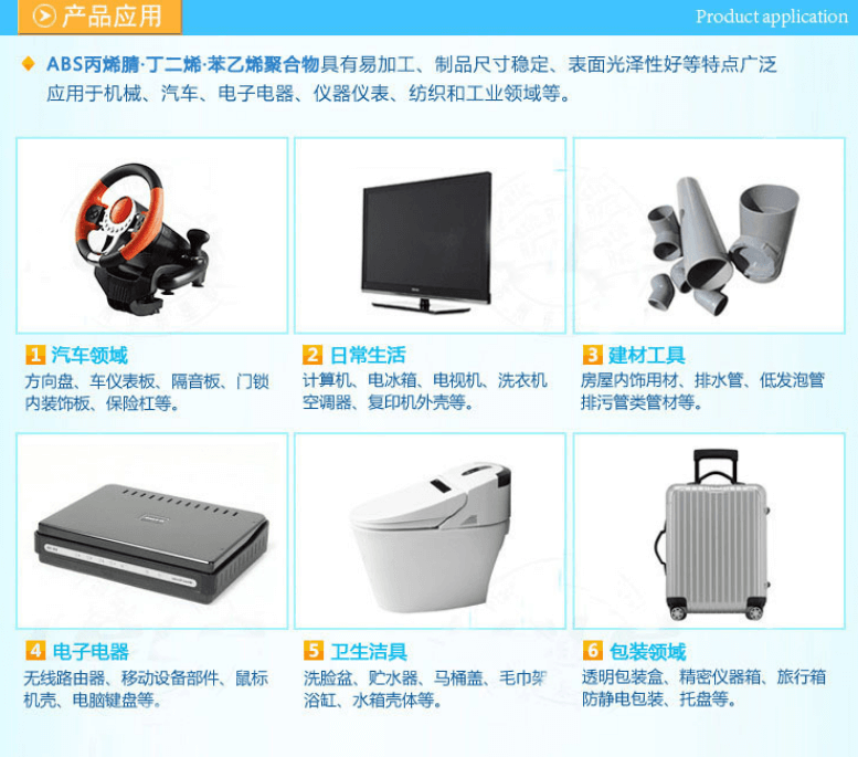 ABS在耐衝擊性、抗拉強度、亮度及硬度等物理性能方麵較PS尤佳,也由於其優異的加工性能而被廣泛地應用於各種用途上,包括汽機車業、手提箱、水管閥門、玩具、資訊產品等。另有自行研發符合認證標準之耐燃級ABS,主要用以資訊產業用材料,如電腦外殼、數據機、監視器外殼等。
